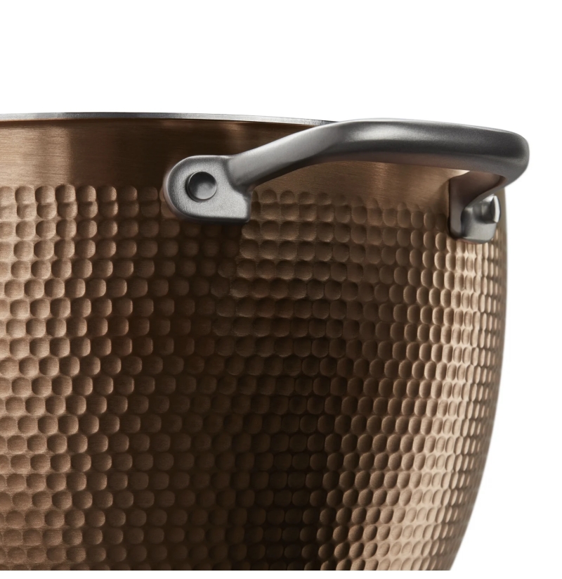 Tepaná měděná mísa o objemu 4,7 l s vnitřkem z nerezové oceli a klasickými hrncovými rukojeťmi si postupem času vyvine jedinečnou patinu, která odráží váš růst jako tvůrce. V průběhu času měděný povrch ztmavne a na míse vzniknou vzory a textury, které jí dodají jedinečný vzhled.