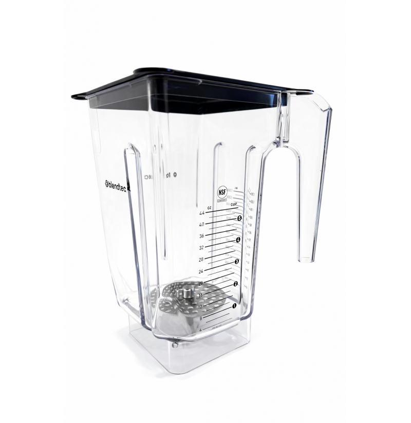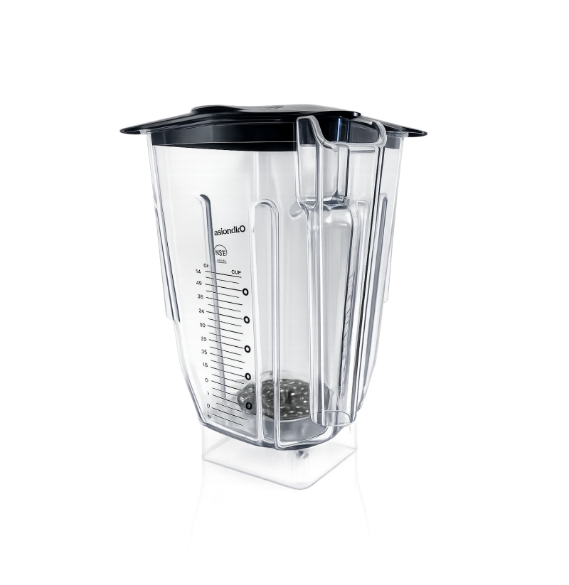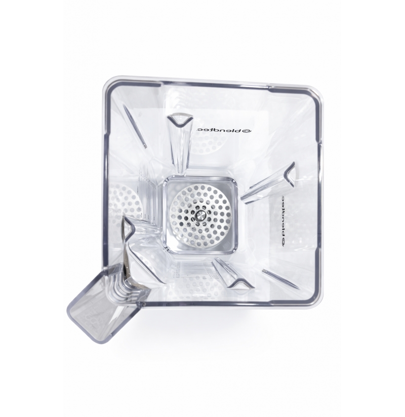 - Zkosené rohy snižují zabíranou plochu na dně nádoby, čímž udržují ingredience proudící k čepeli, čímž se snižuje kavitace a opětovné mixování. Zmenšená spodní strana také umožňuje menší recepty.