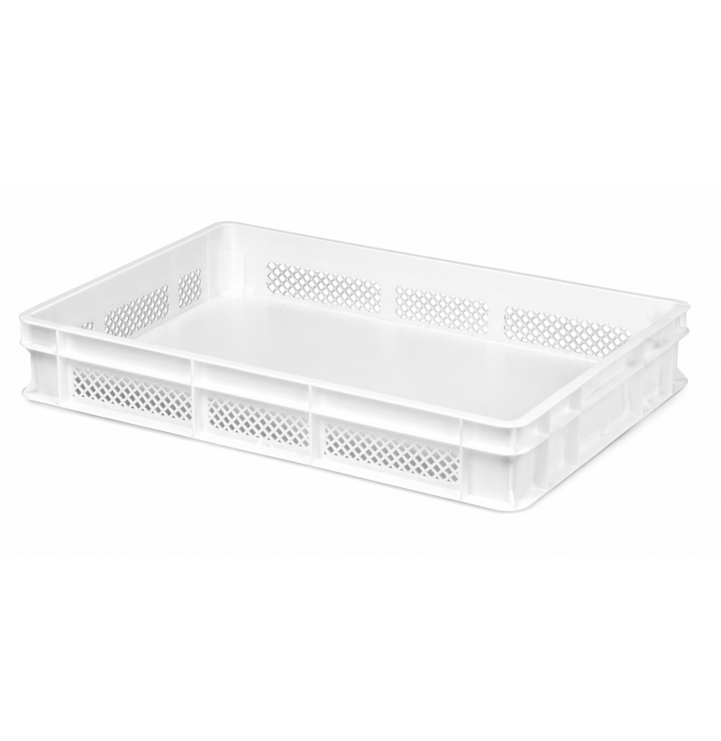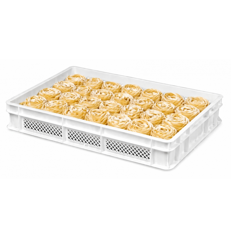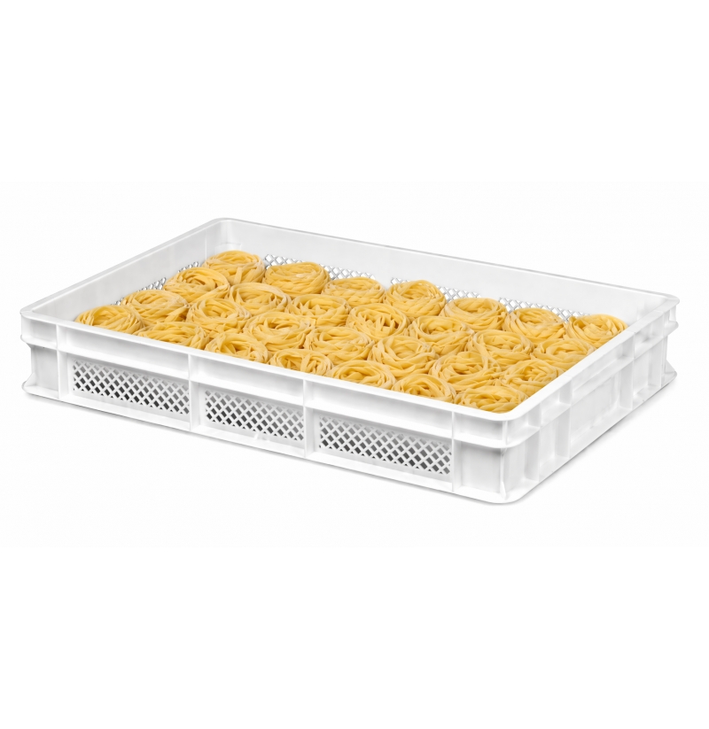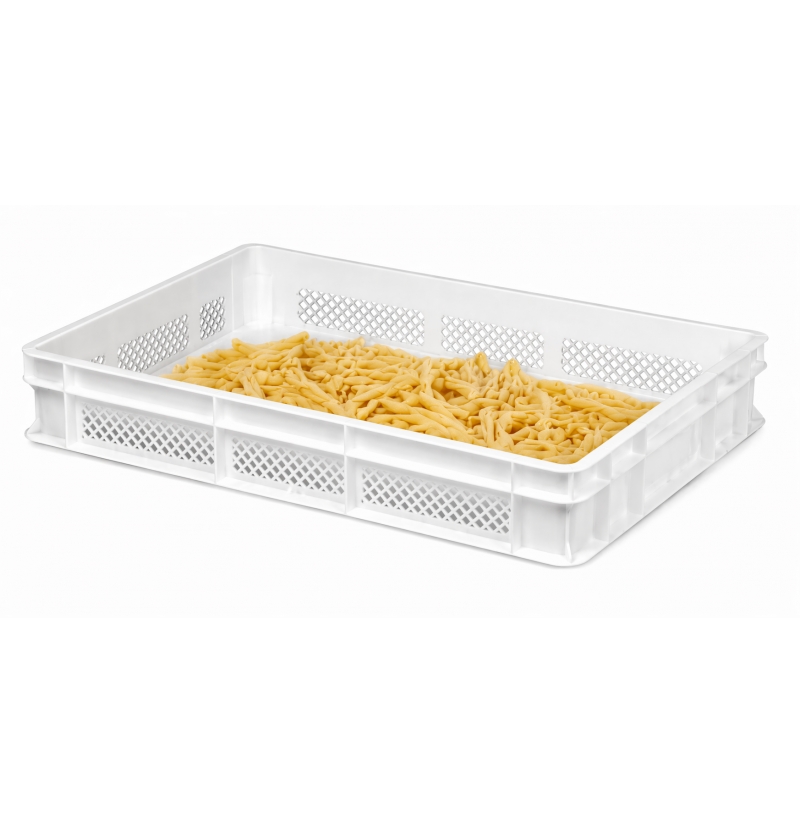 SklademBílá děrovaná přepravka 60x40x10 cm pro skladování čerstvých vyrobených těstovin (pasty), vhodná ke stohování na sebe. Výška 10 cm. Bez víka.