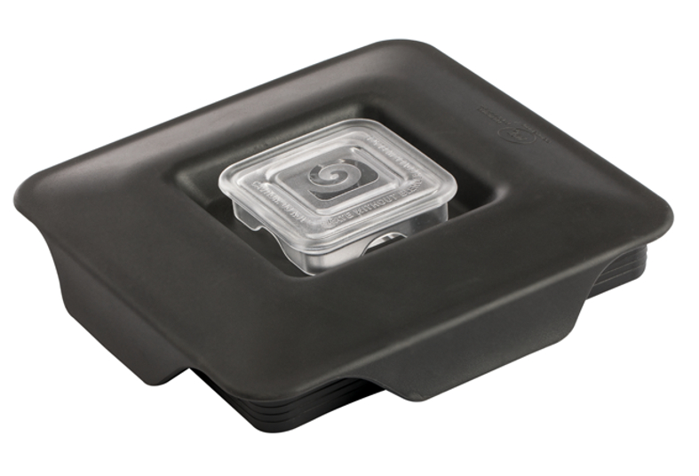 - Zkosené rohy snižují zabíranou plochu na dně nádoby, čímž udržují ingredience proudící k čepeli, čímž se snižuje kavitace a opětovné mixování. Zmenšená spodní strana také umožňuje menší recepty.