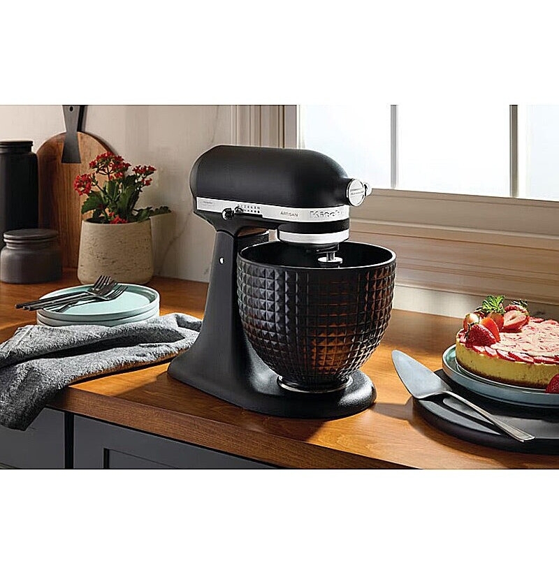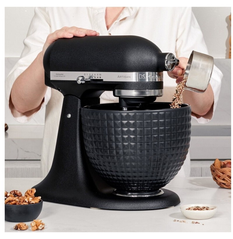Součástí je rovněž černá keramická mísa o objemu 4,8 litru (5KSM2CB5LS) a to pro mixování až do hmotnosti 1 kg mouky (cca 2 kg těsta).